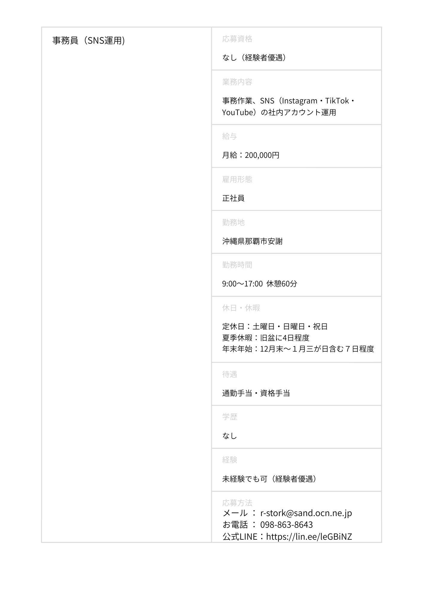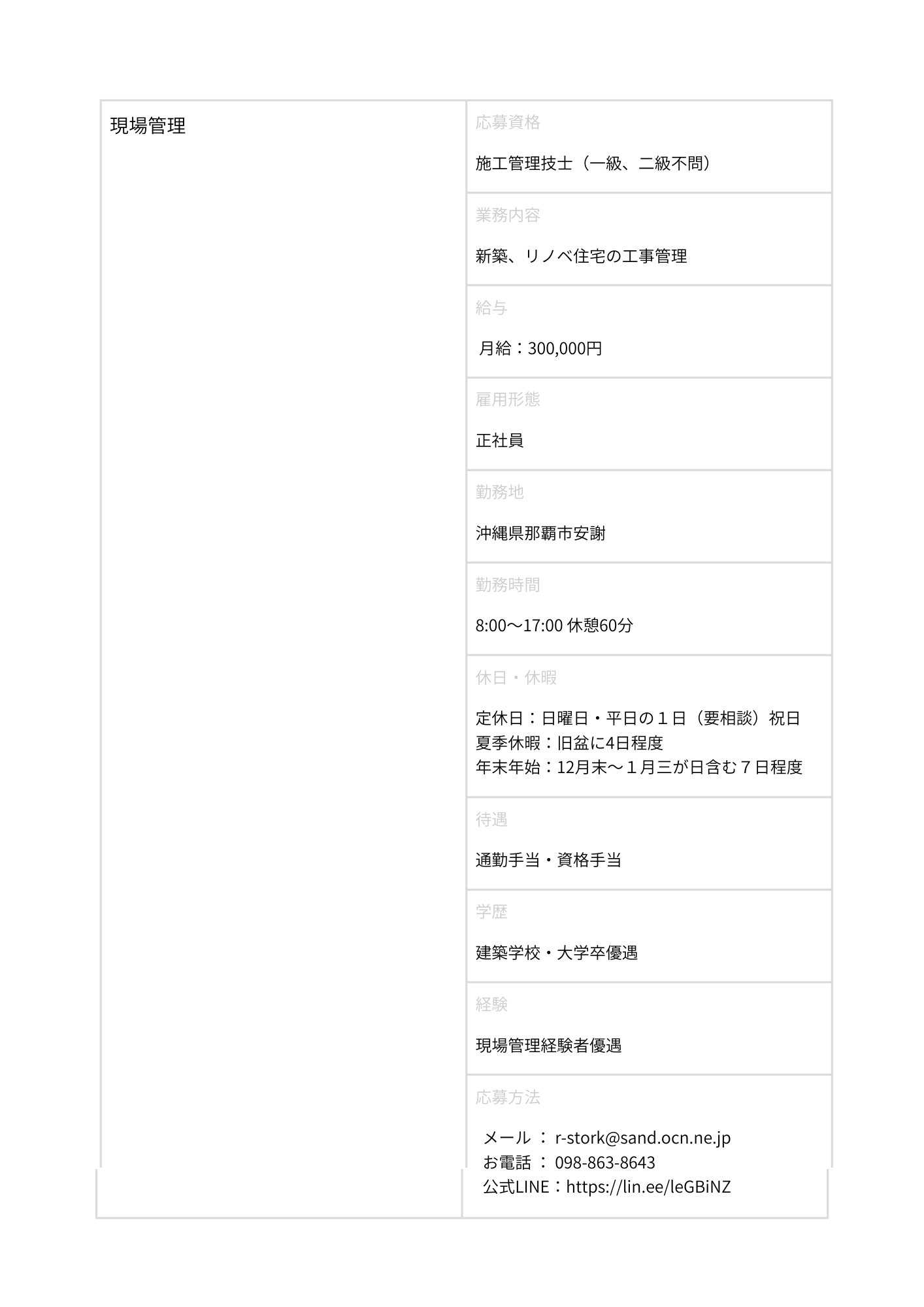 イベント 2025.12.10 沖縄の家づくりを支える仲間を募集しています ! https://ros-cms-data.s3.ap-northeast-1.amazonaws.com/_file/17828/444ad9e177.png 私たちは地域に根ざした工務店として、お客様の暮らしに寄り添った家づくりを行っています。現場を丁寧に仕上げる姿勢と、チームとして協力し合う風土を大切にしています。 経験者はもちろん、未経験でも“家が好き・人が好き”であれば大歓迎。先輩がしっかりサポートするので、安心して技術を身につけられます。私たちと一緒に、ワクワク誇れる仕事をしてみませんか? 応募前に職場の雰囲気を知りたい方は、お気軽にお問い合わせください!